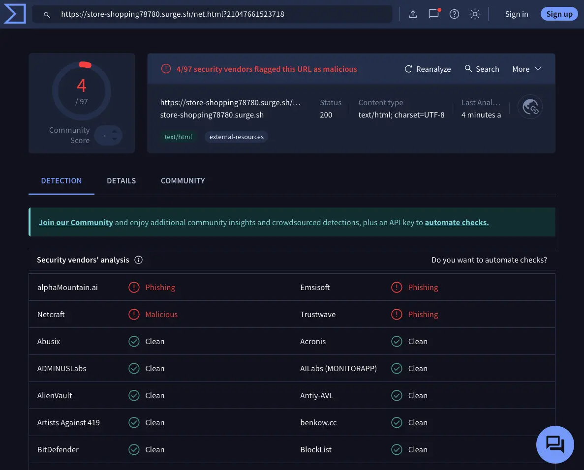Antivirus evasion: Most security engines report the link as “clean” in the early stages, while only a minority flag the threat.